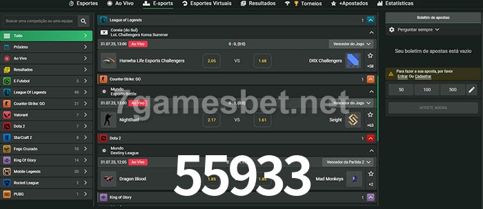 O 55933 oferece uma grande seleção de opções de apostas em e-sports com probabilidades competitivas